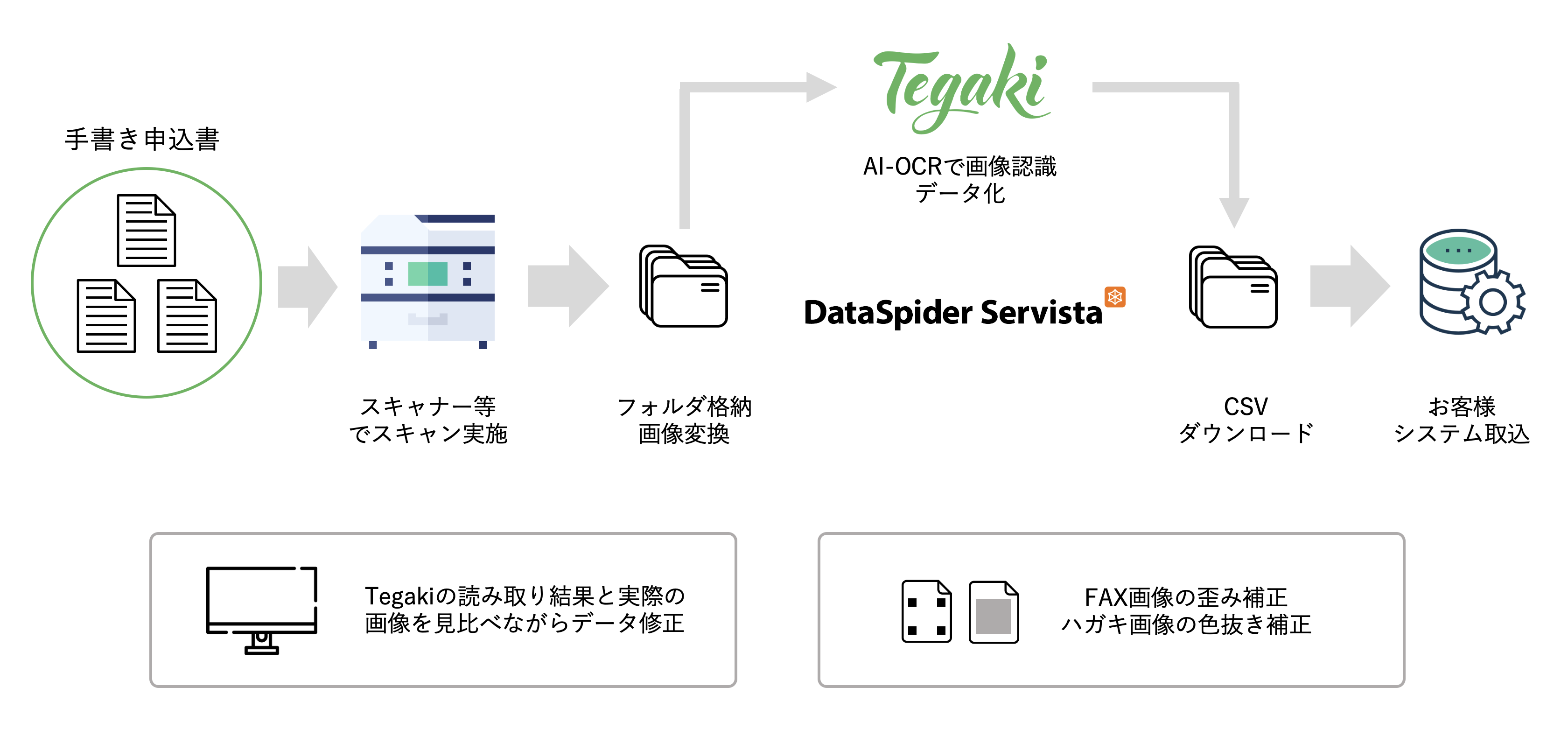 まず、手書きの注文書をスキャナーなどで画像データに変換した後、フォルダ内にデータを格納することで一連の処理が開始されます。「DataSpider Servista」によって格納されたデータが「Tegaki」に送られ、読み取り処理が完了すると、自動で読み取り結果がCSVでダウンロードされます。その後、「DataSpider Servista」を通じてシステムにデータの取り込みが行われるという流れです。