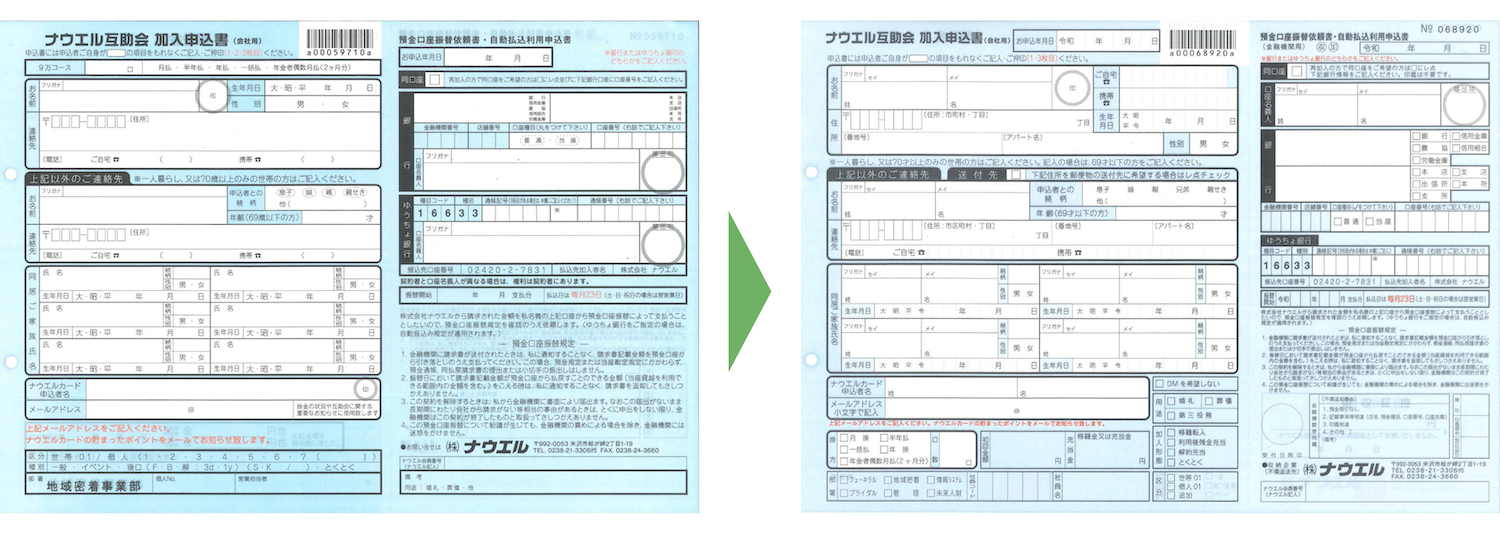 また、Tegaki導入前に活用していた加入申込書のフォーマットでは満足のいく読取精度が出なかったので、フォーマットを何度かアップデートしました。具体的には、記入項目のスペースを広くとったり、単線の項目をボックスキャラクターに変更したり、コージェントラボさんに色々とアドバイスをいただきながらフォーマットを変更していきました。