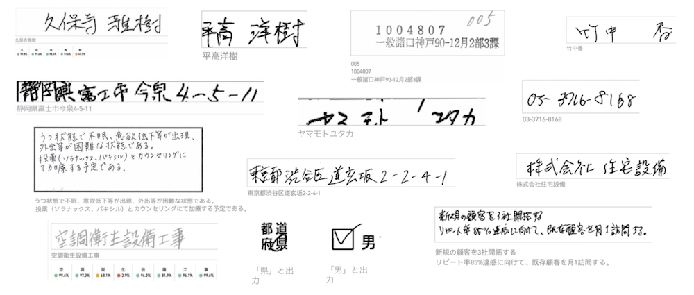 ご覧いただければわかるように、手書き文字は文字の大きさから筆記体、文字間隔がバラバラです。また漢字、ひらがな、カタカナ、数字、英単語とあらゆる文字があります。